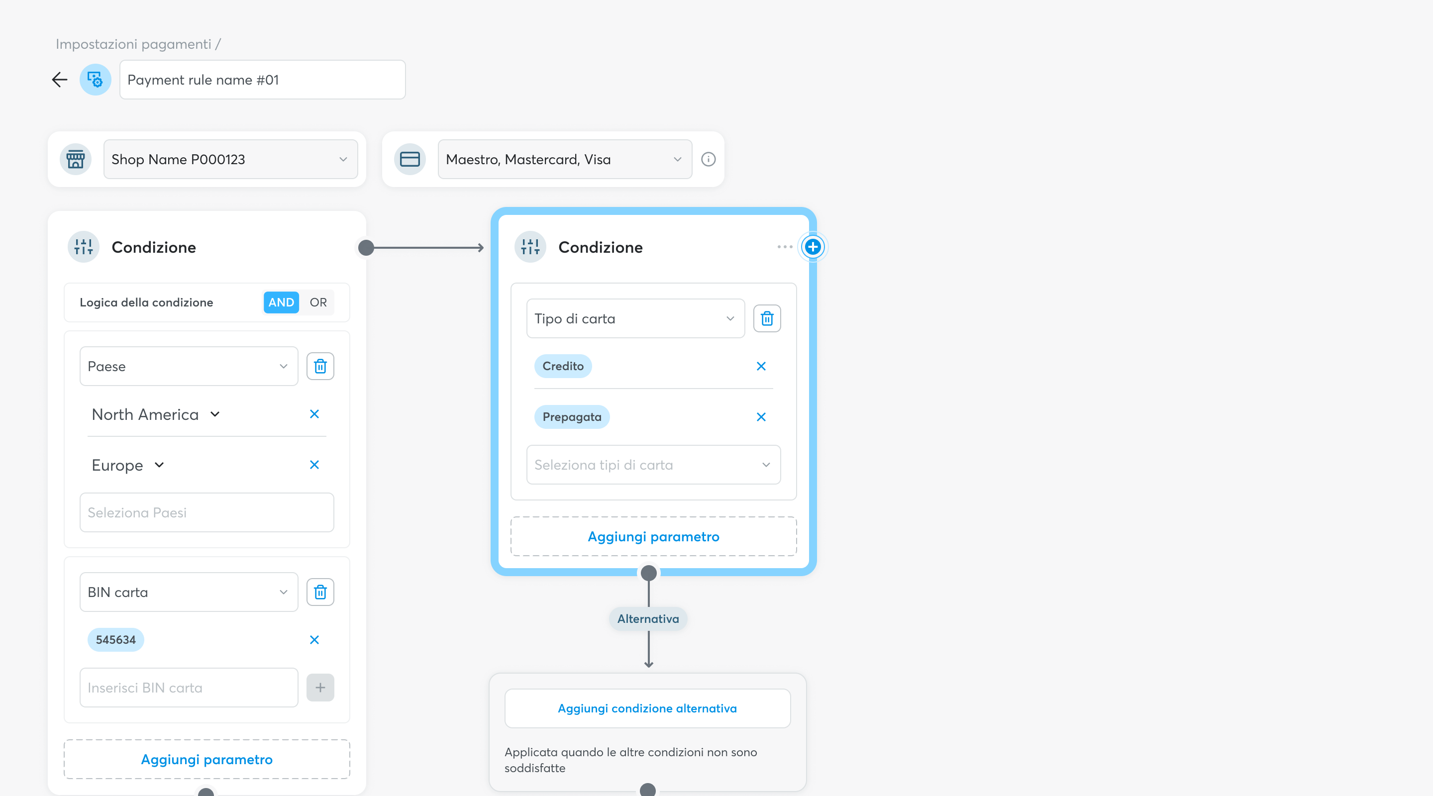 Le transazioni che non soddisfano la Condizione seguiranno il percorso verso il basso, che può comprendere una Condizione alternativa tramite cui gestire questi pagamenti. La Condizione alternativa viene generata cliccando sull’apposito box e prevede la configurazione di nuova Condizione secondo un procedimento analogo a quello della principale.