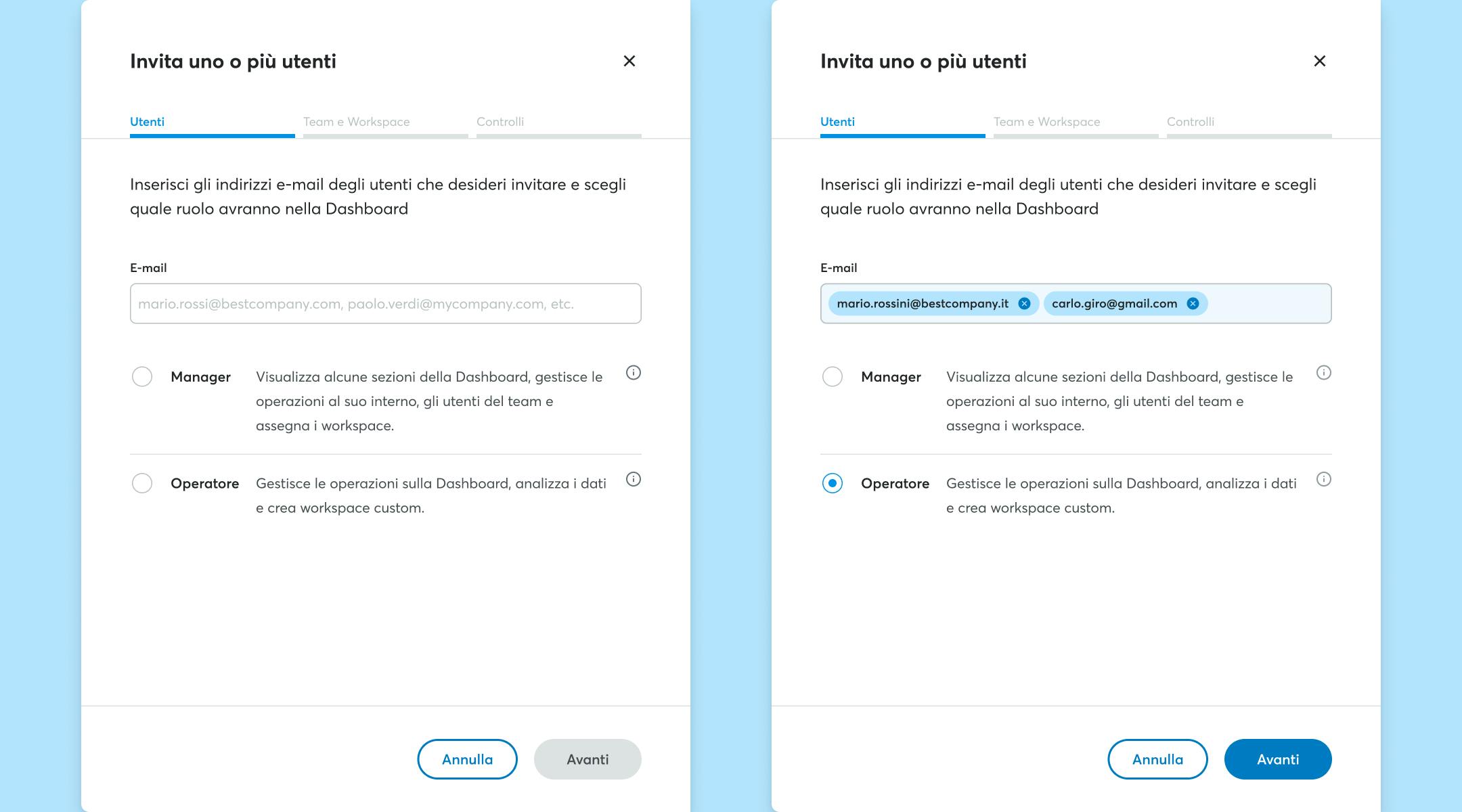 - Operatore: può gestire le operazioni sulla Dashboard e/o analizzarne i dati ma non gestire Utenti né Workspace.